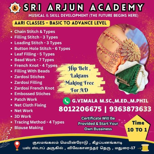 Master traditional Aari embroidery with detailed stitching techniques.Create elegant designs for blouses, sarees.