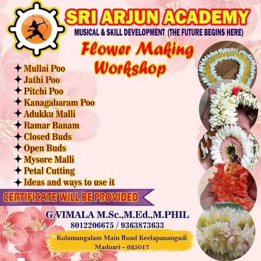 Sri Arjun Academy presents a creative and traditional Flower Making Workshop, designed for beginners and craft enthusiasts who want to learn the art of making decorative flower garlands.